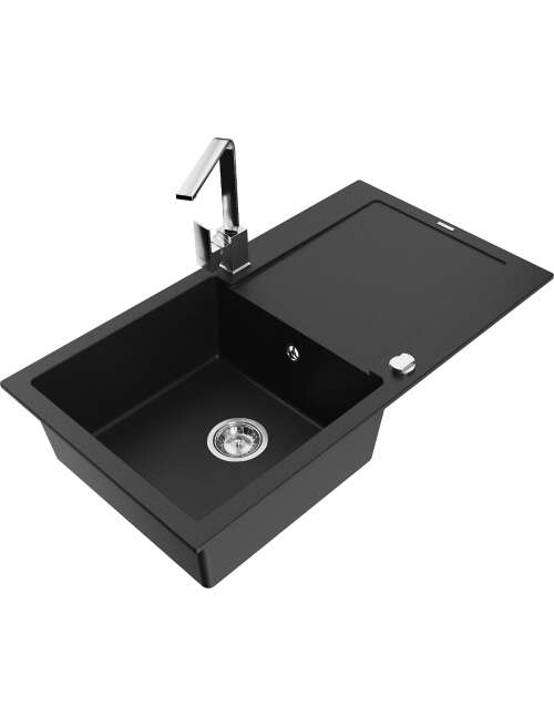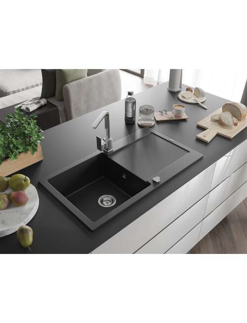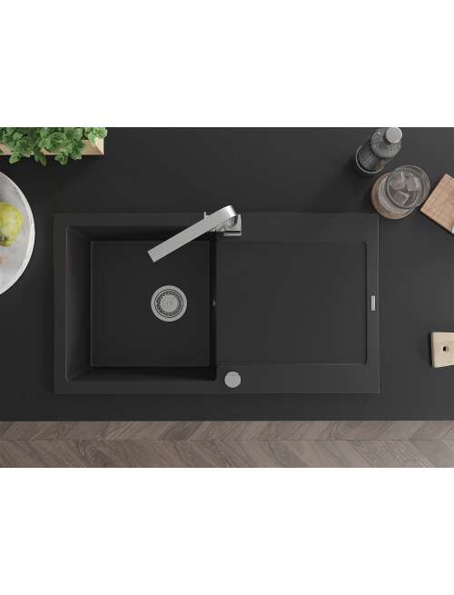 Dane techniczne: Zlewozmywak: Rozmiar: 900x500x190 mm Głębokość komory: 180 mm Wymiary komory: 430x415 mm Średnica odpływu: ø90 mm Typ: 1-komorowy z ociekaczem Rodzaj: Wpuszczany w blat Kolor: Czarny Wykończenie syfonu: Chrom Materiał: Granit (80% kruszywo granitowe 20% żywice) Otwór przelewowy: Tak Otwory: ( bateria, automat ) 2 Montaż: Uniwersalny, możliwość montażu z ociekaczem po lewej lub prawej stronie Wysoka odporność na zarysowania i przebarwienia Odporność na szok termiczny Powierzchnia ułatwiająca czyszczenie Dwa dodatkowe podfrezowane otwory do samodzielnego wybicia ø35 Bateria kuchenna: Materiał: Mosiądz Kolor: Chrom Głowica: Ceramiczna Perlator: Tak Typ: Jednouchwytowa Wysokość baterii: 290 mm Zasięg wylewki: 220 mm |