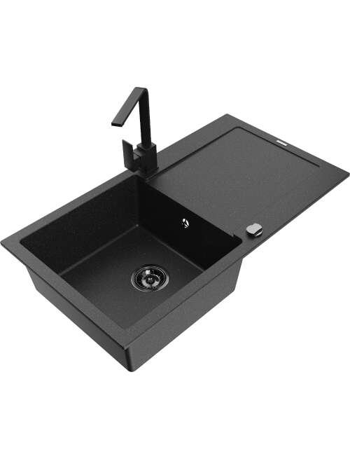 Dane techniczne: Zlewozmywak: Rozmiar: 900x500x190 mm Głębokość komory: 180 mm Wymiary komory: 430x415 mm Średnica odpływu: ø90 mm Typ: 1-komorowy z ociekaczem Rodzaj: Wpuszczany w blat Kolor: Czarny/Srebrny metalik Wykończenie syfonu: Czarny Materiał: Granit (80% kruszywo granitowe 20% żywice) Otwór przelewowy: Tak Otwory: ( bateria, automat ) 2 Montaż: Uniwersalny, możliwość montażu z ociekaczem po lewej lub prawej stronie Wysoka odporność na zarysowania i przebarwienia Odporność na szok termiczny Powierzchnia ułatwiająca czyszczenie Dwa dodatkowe podfrezowane otwory do samodzielnego wybicia ø35 Bateria kuchenna: Materiał: Mosiądz Kolor: Czarny Głowica: Ceramiczna Perlator: Tak Typ: Jednouchwytowa Wysokość baterii: 290 mm Zasięg wylewki: 220 mm |