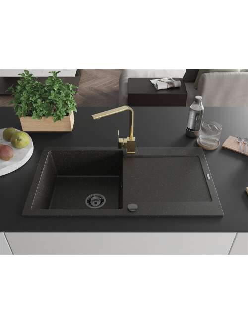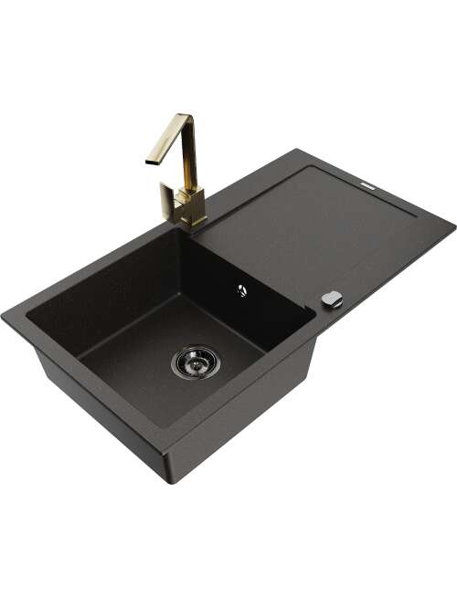 Mexen Leo zlewozmywak granitowy 1-komorowy z ociekaczem i baterią kuchenną Rita, czarny/złoty metalik - 6501-75-670300-50-B
