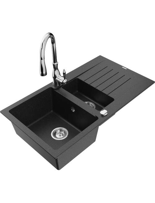 Dane techniczne: Zlewozmywak: Rozmiar: 900x505x200 mm Głębokość komory: 180 mm (większa), 115 mm (mniejsza) Wymiary komory: 435x335 mm (większa), 345x150 mm (mniejsza) Średnica odpływu: ø90 mm Typ: 1,5-komorowy z krótkim ociekaczem Rodzaj: Wpuszczany w blat Kolor: Czarny/srebrny metalik Wykończenie syfonu: Chrom Materiał: Granit (80% kruszywo granitowe 20% żywice) Otwór przelewowy: Tak Otwory: ( bateria, automat ) 2 Montaż: Uniwersalny, możliwość montażu z ociekaczem po lewej lub prawej stronie Wysoka odporność na zarysowania i przebarwienia Odporność na szok termiczny Powierzchnia ułatwiająca czyszczenie Dwa dodatkowe podfrezowane otwory do samodzielnego wybicia ø35 Bateria kuchenna: Materiał: Mosiądz Kolor: Chrom Głowica: Ceramiczna Perlator: Tak Wysokość baterii: 410 mm Zasięg wylewki: 231 mm |