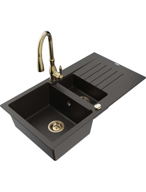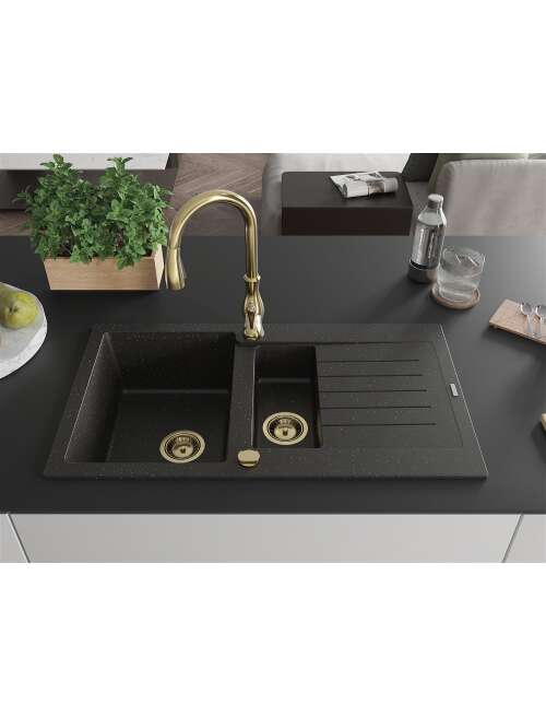 Dane techniczne: Zlewozmywak: Rozmiar: 900x505x200 mm Głębokość komory: 180 mm (większa), 115 mm (mniejsza) Wymiary komory: 435x335 mm (większa), 345x150 mm (mniejsza) Średnica odpływu: ø90 mm Typ: 1,5-komorowy z krótkim ociekaczem Rodzaj: Wpuszczany w blat Kolor: Czarny/Złoty metalik Wykończenie syfonu: Złoty Materiał: Granit (80% kruszywo granitowe 20% żywice) Otwór przelewowy: Tak Otwory: ( bateria, automat ) 2 Montaż: Uniwersalny, możliwość montażu z ociekaczem po lewej lub prawej stronie Wysoka odporność na zarysowania i przebarwienia Odporność na szok termiczny Powierzchnia ułatwiająca czyszczenie Dwa dodatkowe podfrezowane otwory do samodzielnego wybicia ø35 Bateria kuchenna: Materiał: Mosiądz Kolor: Złoty Głowica: Ceramiczna Perlator: Tak Wysokość baterii: 410 mm Zasięg wylewki: 231 mm |