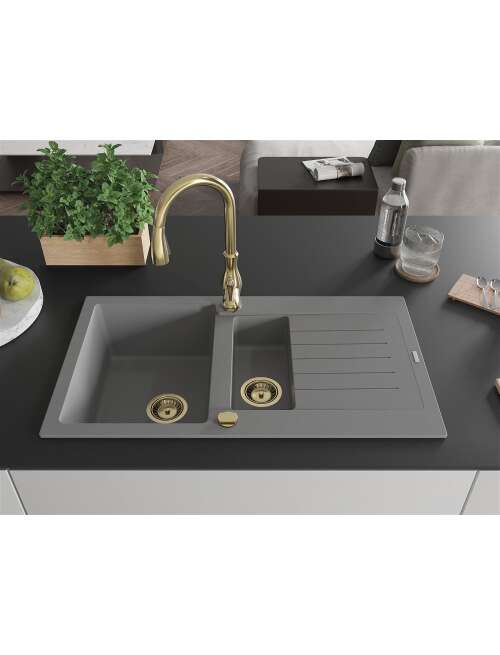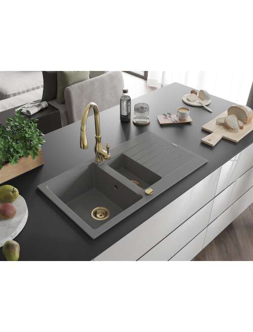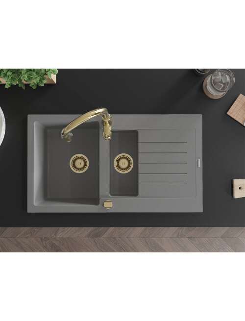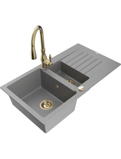 Mexen Matias zlewozmywak granitowy 1,5-komorowy z ociekaczem i baterią kuchenną Savita, szary - 6502-71-672601-50