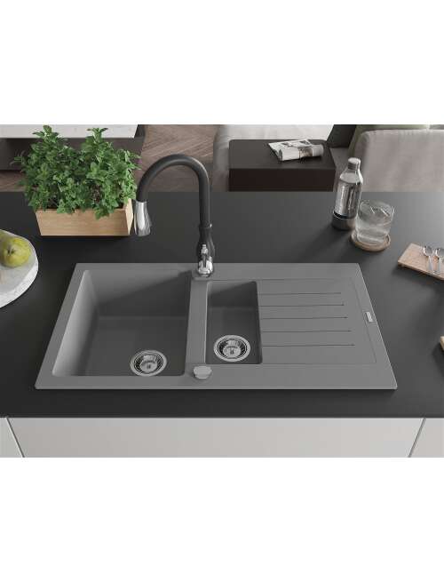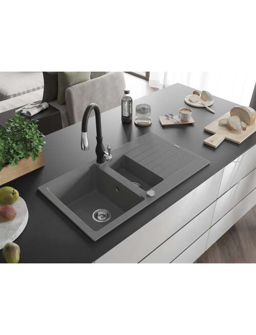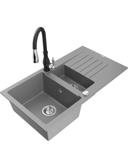 Mexen Matias zlewozmywak granitowy 1,5-komorowy z ociekaczem i baterią kuchenną Savita, szary - 6502-71-672601-70