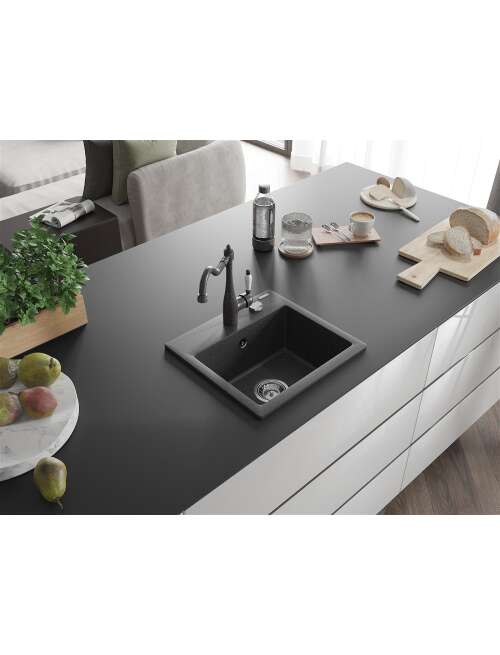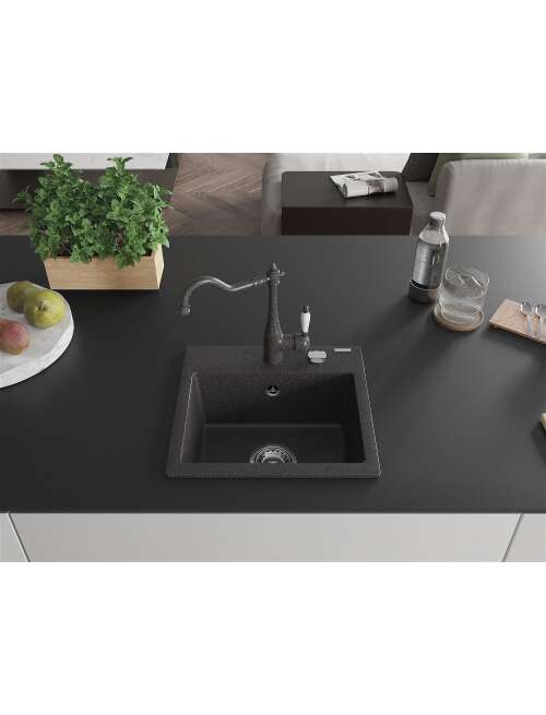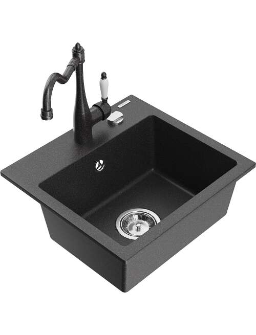 Dane techniczne: Zlewozmywak: Rozmiar: 435x410x171 mm Głębokość komory: 161 mm Wymiary komory: 375x280 mm Średnica odpływu: ø90 mm Typ: 1-komorowy Rodzaj: Wpuszczany w blat Kolor: Czarny nakrapiany Wykończenie syfonu: Chrom Materiał: Granit (80% kruszywo granitowe 20% żywice) Otwór przelewowy: Tak Otwory: ( bateria, automat ) 2 Wysoka odporność na zarysowania i przebarwienia Odporność na szok termiczny Powierzchnia ułatwiająca czyszczenie Jeden dodatkowy podfrezowany otwór do samodzielnego wybicia ø35 Bateria kuchenna: Materiał: Mosiądz Kolor: Czarny nakrapiany Głowica: Ceramiczna Perlator: Tak Typ: Jednouchwytowa Wysokość baterii: 290 mm Zasięg wylewki: 260 mm |
