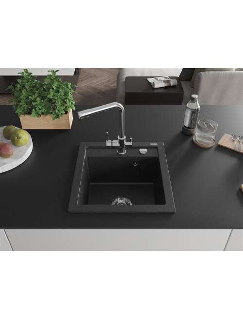Dane techniczne: Zlewozmywak: Rozmiar: 520x490x210 mm Głębokość komory: 200 mm Wymiary komory: 410x360 mm Średnica odpływu: ø90 mm Typ: 1-komorowy Rodzaj: Wpuszczany w blat Kolor: Czarny/Srebrny metalik Wykończenie syfonu: Chrom Materiał: Granit (80% kruszywo granitowe 20% żywice) Otwór przelewowy: Tak Otwory: ( bateria, automat ) 2 Wysoka odporność na zarysowania i przebarwienia Odporność na szok termiczny Powierzchnia ułatwiająca czyszczenie Jeden dodatkowy podfrezowany otwór do samodzielnego wybicia ø35 Bateria kuchenna: Materiał: Mosiądz Kolor: Chrom Głowica: Ceramiczna Perlator: Tak Typ: Dwuuchwytowa Zasięg wylewki: 235 mm Wysokość baterii: 315 mm Bateria dwugłowicowa z dodatkowym filtrem do wody pitnej |