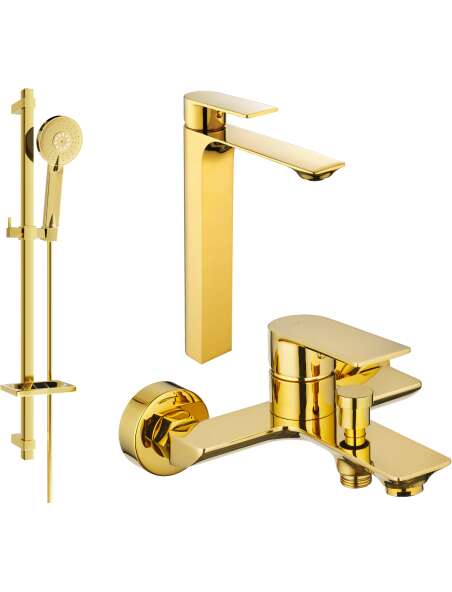 Specyfikacja produktu:Materiał baterii umywalkowej: Mosiądz Wykończenie baterii: Złoty Głowica: Ceramiczna Wysokość: 295 mm Zasięg wylewki: 195 mm Materiał baterii wannowej: Mosiądz Wykończenie baterii: Złoty Głowica: Ceramiczna Rodzaj wylewki: Stała Zasięg wylewki: 167 mm Materiał drążka: Stal nierdzewna, ABS Wykończenie drążka: Złoty Wysokość: 800 mm Szerokość drążka: 22 mm Odległość od ściany: 160 mm Mydelniczka Przesuwny uchwyt na słuchawkę Regulowane uchwyty montażowe Materiał słuchawki: Tworzywo sztuczne Wykończenie słuchawki: Złoty Ilość funkcji: 3 Wysokość słuchawki: 240 mm Wymiary główki: ø108 mm Materiał wąż: PVC Wykończenie węża: Złoty Długość węża: 150 cm Mosiężne końcówki Gładka powierzchnia ułatwia utrzymanie w czystości Obrotowe końcówki zapobiegają skręcaniu Elastyczny materiał wytrzymały na rozciąganie oraz zginanie |