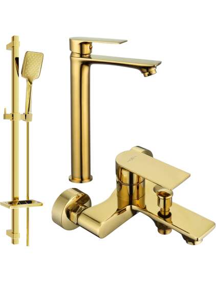 Specyfikacja produktu:Materiał baterii umywalkowej: Mosiądz Głowica: Ceramiczna Wykończenie baterii: Złoty Wysokość: 290 mm Zasięg wylewki: 120 mm Materiał baterii wannowej: Mosiądz Wykończenie baterii: Złoty Głowica: Ceramiczna Zasięg wylewki: 173 mm Materiał drążka: Stal nierdzewna, ABS Wykończenie drążka: Złoty Wysokość: 800 mm Szerokość drążka: 22 mm Odległość od ściany: 160 mm Mydelniczka Przesuwny uchwyt na słuchawkę Regulowane uchwyty montażowe Materiał słuchawki: Tworzywo sztuczne Wykończenie słuchawki: Złoty Ilość funkcji: 1 Wysokość słuchawki: 225 mm Szerokość główki: 80 mm Materiał węża: PVC Wykończenie węża: Złoty Długość węża: 150 cm Gładka powierzchnia ułatwia utrzymanie w czystości Obrotowe końcówki zapobiegają skręcaniu Elastyczny materiał wytrzymały na rozciąganie oraz zginanie |