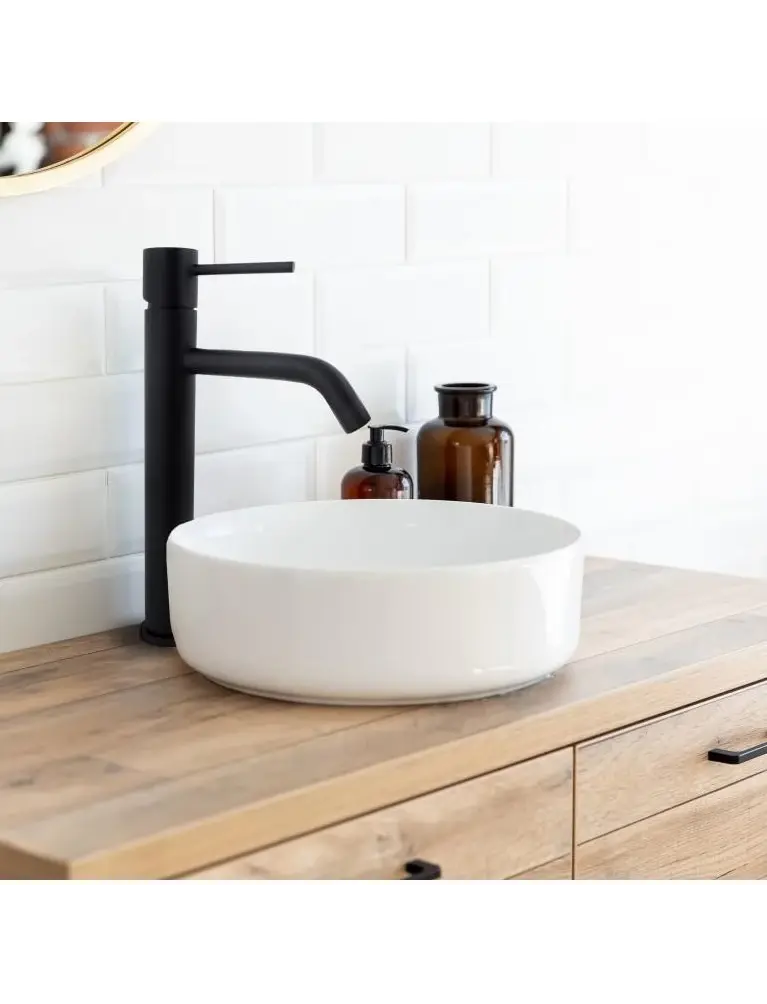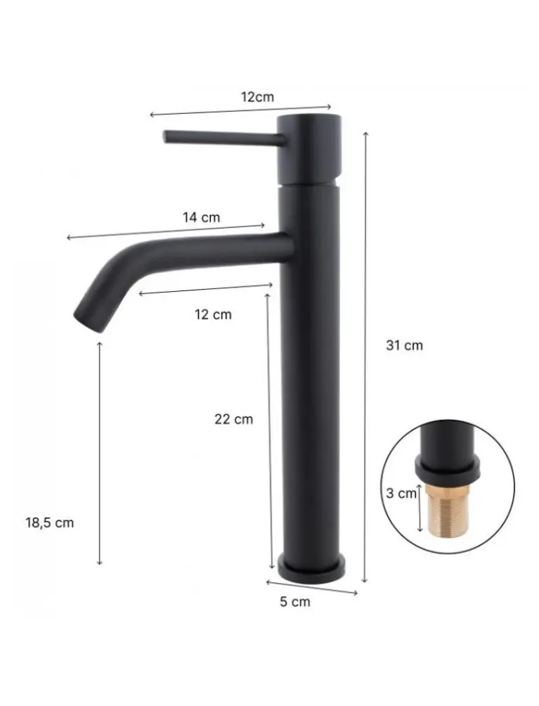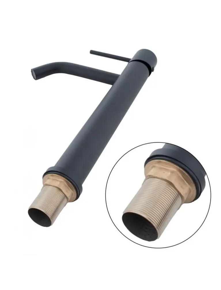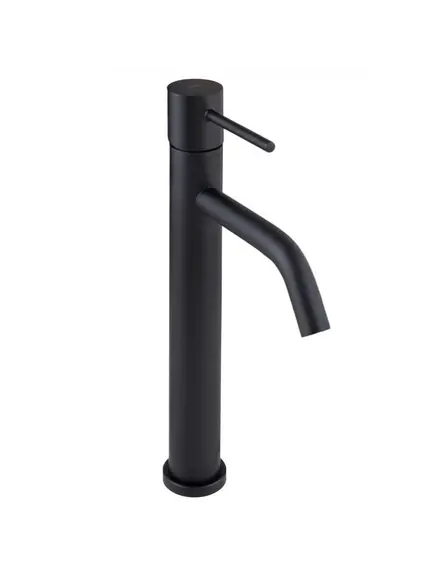 Augsts, brīvi stāvošs vienas sviras izlietnes jaucējkrāns ar fiksētu melnu snīpi. Melnās virsmas izcilo kvalitāti garantē moderna pulverkrāsošanas tehnoloģija. Keramikas galva nodrošina izturību un izturību.