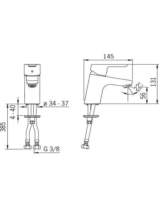 Izlietnes jaucējkrāns bez noteces aizvara. Ar iebūvētu ierobežotāja mehānismu var regulēt maksimālo ūdens plūsmu un temperatūru. F – ar lokaniem ūdens pievadiem