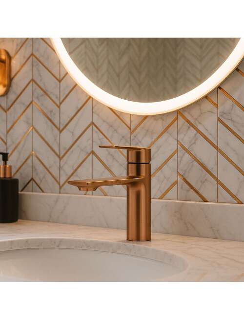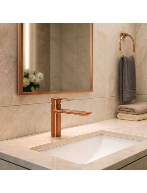 Prezentujemy Państwu piękną, niezwykle funkcjonalną i nowoczesną baterię. Jest to produkt, który w doskonały sposób wypełni Państwa przestrzeń łazienkową zachowując nienaganny wygląd i estetykę wnętrza. Bateria jest przystosowana do montażu na blacie lub na umywalce. Została wykonana z mosiądzu pokrytego wykończeniem w kolorze szczotkowanej miedzi. Dzięki specjalnej fazie produkcji jest trwała i łatwa w utrzymaniu czystości.