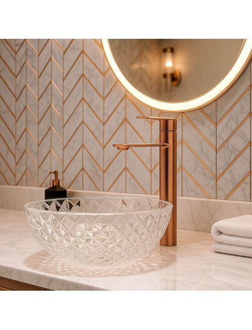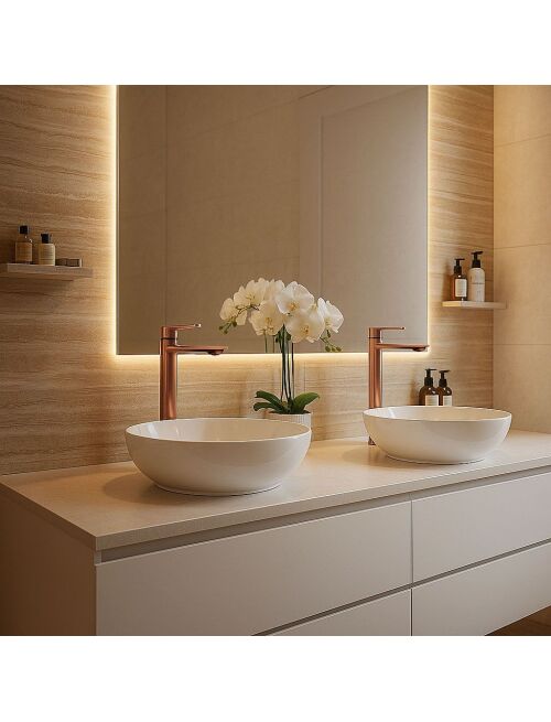 Prezentujemy Państwu piękną, niezwykle funkcjonalną i nowoczesną baterię. Jest to produkt, który w doskonały sposób wypełni Państwa przestrzeń łazienkową zachowując nienaganny wygląd i estetykę wnętrza. Bateria jest przystosowana do montażu na blacie przy umywalce. Została wykonana z mosiądzu pokrytego wykończeniem w kolorze szczotkowanej miedzi. Dzięki specjalnej fazie produkcji jest trwała i łatwa w utrzymaniu czystości. Powierzchnia została wykonana w technologii electroplating, co zapewnia wyjątkową odporność na ścieranie, uszkodzenia i trwałość przez lata . Wbudowany perlator pozwala ograniczyć zużycie wody, a ceramiczna głowica zapewnia płynną regulację strumienia i temperatury.