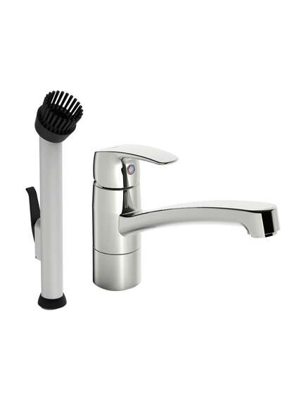 Virtuves jaucējkrāns ar birsti. Grozāma izteka ar aeratoru. Iztekas pagrieziena leņķa iestatījums rūpnīcā ir 100º (ierobežotāju var izņemt). Lieliska gredzenveida svira sniedz ērtu lietojamību visās situācijās. Ar iebūvētu ierobežotāja mehānismu var regulēt maksimālo ūdens plūsmu un temperatūru.