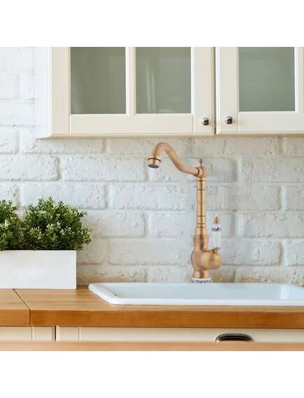Mehānisks vienas sviras izlietnes maisītājs zelta krāsā ar baltām detaļām un elegantu dekoru. Korpuss ir izgatavots no pirmās klases misiņa. Keramikas kārtridžs (35 mm). Jaucējkrānam ir garš un ērts snīpis.