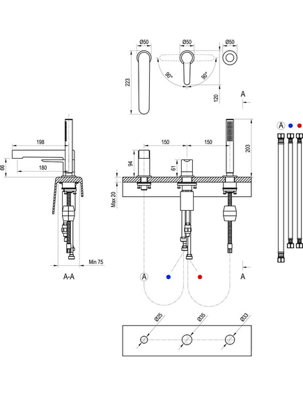 Puri black trīs izvadu jaucējkrānam ir īpaša rotējoša kasetne ar vannas / dušas pārslēgšanu. Pārvietojot sviru pa labi (duša) vai pa kreisi (vanna) tiek regulēta tikai ūdens temperatūra, nevis ūdens plūsma, kas ir stabila. Jaucējkrāna komplektā ietilpst izvelkama duša ar 175 cm garu šļūteni.