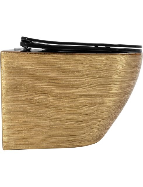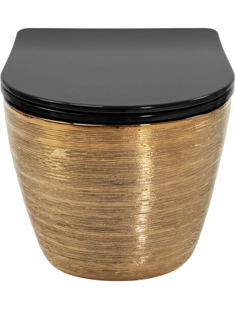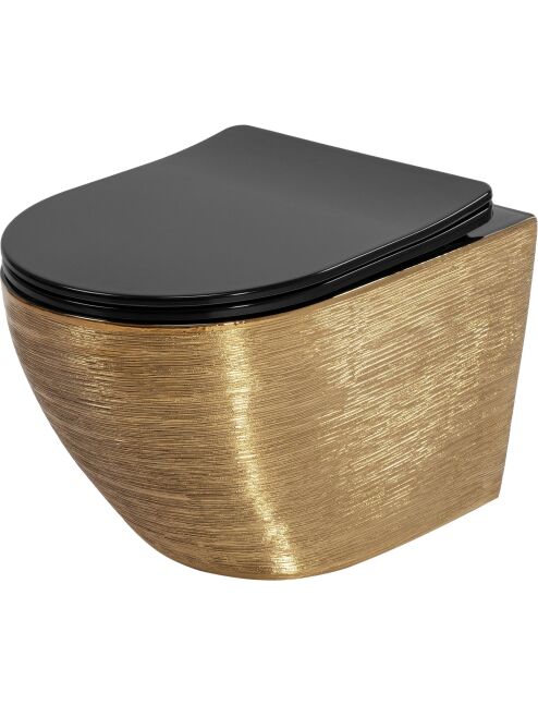 Podwieszana misa WC Carlo Mini Tornado w ekskluzywnym połączeniu czerni i szczotkowanego złota to propozycja dla osób, które chcą nadać swojej łazience nowoczesny i luksusowy charakter. Wyjątkowe wykończenie sprawia, że model staje się wyrazistym elementem aranżacji, idealnie komponując się z designerską armaturą i nowoczesnymi dodatkami.