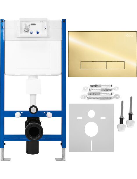 W zestawie znajduje się przycisk spłukujący typu H w kolorze złotym, który idealnie współgra ze stelażem i zapewnia pełną kompatybilność systemu spłukującego.