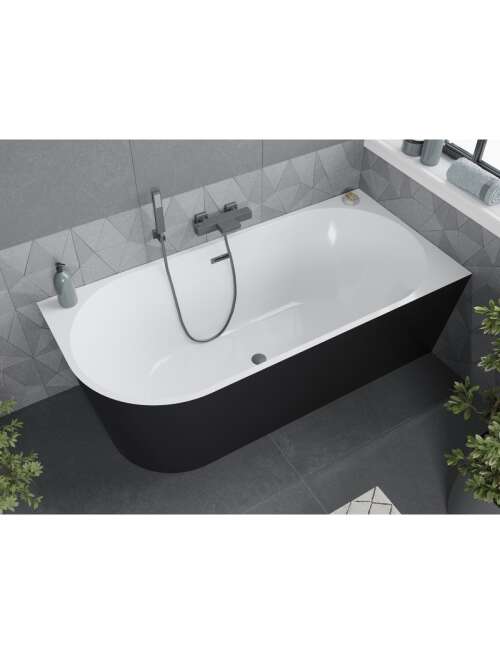 Specyfikacja produktu:Rozmiar: 160 x 80 cm Wysokość: 58 cm Głębokość: 45 cm Montaż: Narożna, Prawa Materiał: Akryl sanitarny Kolor: Biały/Czarny Wykończenie: Gun gray szczotkowany Otwór przelewowy. Tak Otwór na baterie: Nie W komplecie syfon oraz korek klik klak Odporność na matowienie i promienie uv |