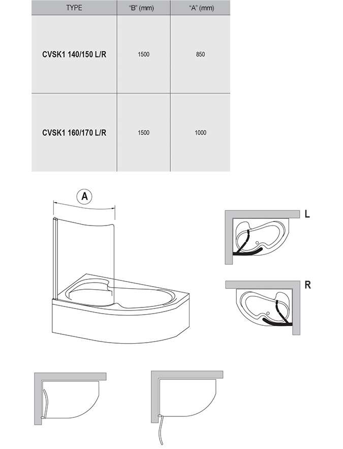 izmēri: 85 cm vannām 140, 150 cm; 100 cm vannām 160, 170 cm