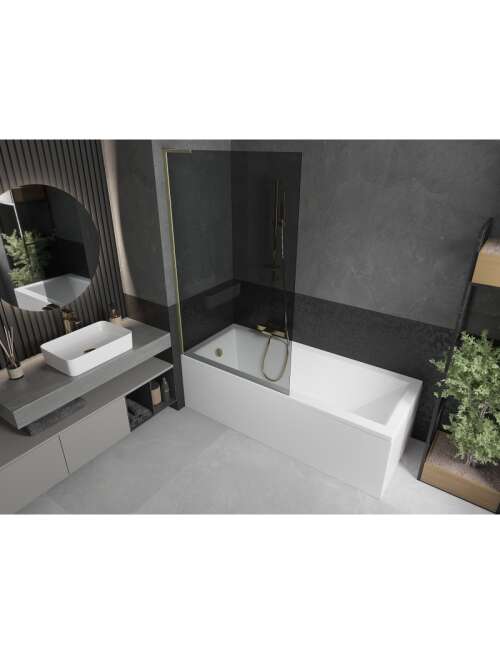 Dane techniczne: Szerokość: 100 cm Wysokość: 150 cm Rodzaj 1-skrzydłowy Montaż: Uniwersalny Typ: Stały Rodzaj szkła: Hartowane Kolor szkła: Grafit Grubość szkła: 6 mm Wykończenie: Złoty szczotkowany Stabilizator kątowy L: Stal nierdzewna Powłoka ułatwiająca czyszczenie Niwelacja nierówności ściany |