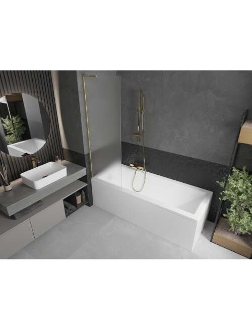 Dane techniczne: Szerokość: 60 cm Wysokość: 150 cm Rodzaj 1-skrzydłowy Montaż: Uniwersalny Typ: Stały Rodzaj szkła: Hartowane Kolor szkła: Szron Grubość szkła: 6 mm Wykończenie: Złoty szczotkowany Stabilizator kątowy L: Stal nierdzewna Powłoka ułatwiająca czyszczenie Niwelacja nierówności ściany |