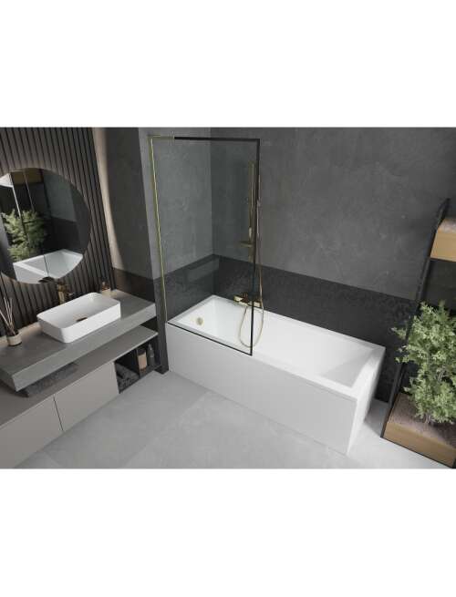 Dane techniczne: Szerokość: 90 cm Wysokość: 150 cm Rodzaj 1-skrzydłowy Montaż: Uniwersalny Typ: Stały Rodzaj szkła: Hartowane Kolor szkła: Czarny wzór Grubość szkła: 6 mm Wykończenie: Złoty szczotkowany Stabilizator kątowy L: Stal nierdzewna Powłoka ułatwiająca czyszczenie Niwelacja nierówności ściany |