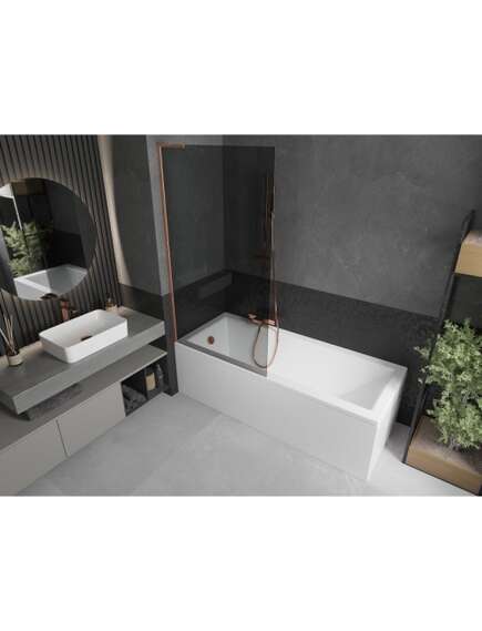 Dane techniczne: Szerokość: 90 cm Wysokość: 150 cm Rodzaj 1-skrzydłowy Montaż: Uniwersalny Typ: Stały Rodzaj szkła: Hartowane Kolor szkła: Grafit Grubość szkła: 6 mm Wykończenie: Miedź szczotkowana Stabilizator kątowy L: Stal nierdzewna Powłoka ułatwiająca czyszczenie Niwelacja nierówności ściany |