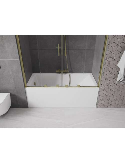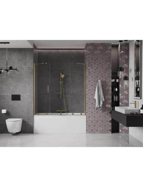 Dane techniczne: Szerokość: 160 cm Wysokość: 150 cm Rodzaj 2-skrzydłowy Montaż: Uniwersalny Typ: Ruchomy/Przesuwny Rodzaj szkła: Hartowane Kolor szkła: Transparentny Grubość szkła: 8 mm Wykończenie: Złote Powłoka ułatwiająca czyszczenie Niwelacja nierówności ściany Komplet uszczelek odprowadzających wodę |