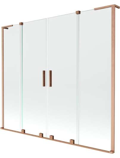 Dane techniczne: Szerokość: 200 cm Wysokość: 150 cm Rodzaj 2-skrzydłowy Montaż: Uniwersalny Typ: Ruchomy/Rozsuwany Rodzaj szkła: Hartowane Kolor szkła: Transparentny Grubość szkła: 8 mm Wykończenie: Miedź szczotkowana Stabilizator kątowy L Powłoka ułatwiająca czyszczenie Niwelacja nierówności ściany Komplet uszczelek odprowadzających wodę |