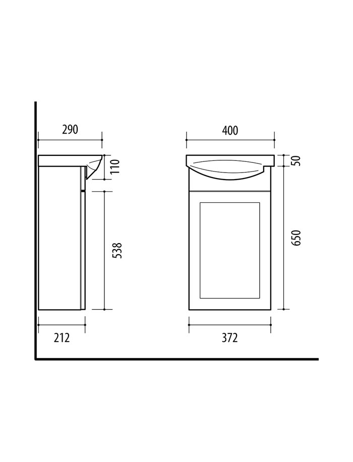Cabinet dimensions 372 x 650 x 212 mm (width, height, depth)