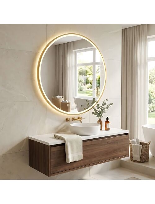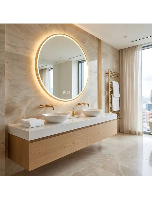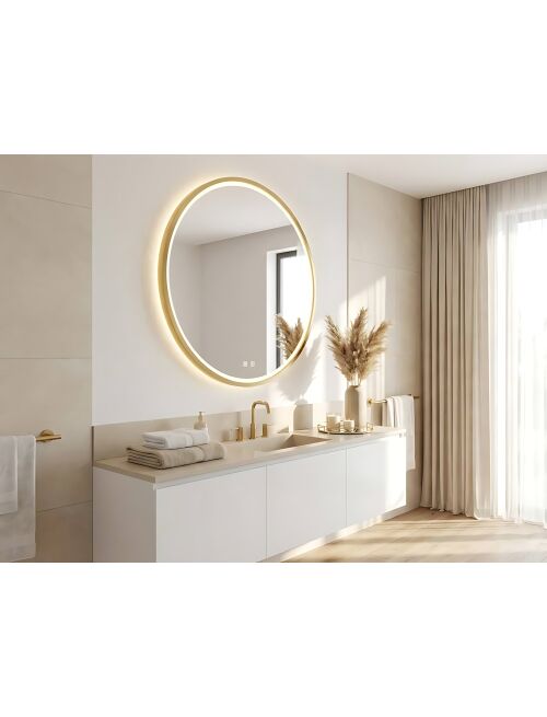 Okrągłe lustro z podświetleniem Led to idealna propozycja dla tych którzy cenią sobie wygodę użytkowania oraz nowoczesny design. Lustro jest wykonane z najwyższej jakości materiałów, idealnie się prezentuje oraz jest bardzo wytrzymałe. Posiada do wyboru trzy zmieniane dotykowo barwy światła Led – ciepła, neutralną i zimną oraz funkcję podgrzewania zapobiegającą zaparowaniu powierzchni. Przełącznik dotykowy umieszczony w tafli lustra podświetlany jest na niebiesko przy aktywności funkcji. Przewód zasilający w kolorze białym o długości 110cm. Grubość lustra: 4 mm