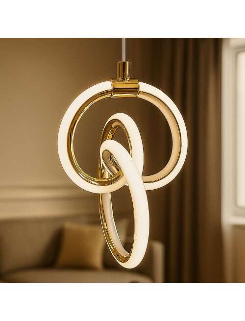 Lampa LED w nowoczesnej formie przeplatających się pierścieni to propozycja dla osób szukających oryginalnego oświetlenia. Wykonana z tworzywa sztucznego, wyróżnia się lekką konstrukcją i eleganckim połyskiem. Zintegrowane źródło światła LED zapewnia równomierne, przyjemne oświetlenie. Lampa doskonale sprawdzi się nad stołem, w salonie lub jako dekoracyjny akcent w nowoczesnym wnętrzu.