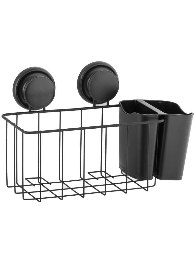 Taisnstūrveida vannas istabas grozs ar papildus piekārtu konteineru, kas piestiprināts pie sienas ar spēcīgu piesūcekni.