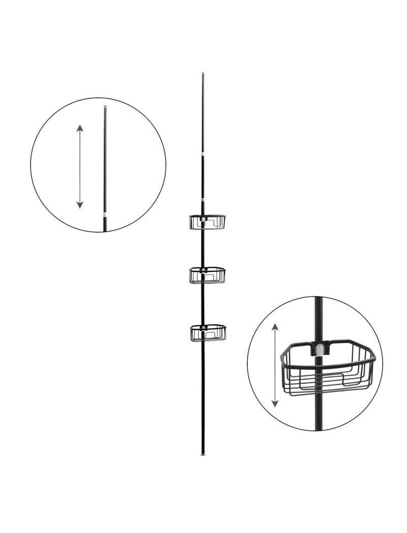 Teleskopisks vannas istabas stūra plaukts. Pulverkrāsots uz melna paklājiņa. Ir 3 alumīnija stūra grozi-plaukti no 100% nerūsējošā tērauda!