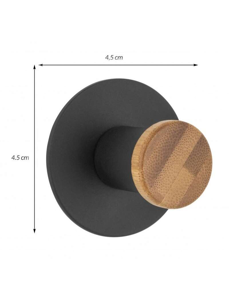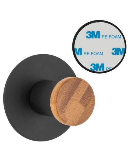 Komplektā 2 dvieļu turētāji, kas piestiprināti pie sienas ar 3M lenti. Ir viens rokturis. Izgatavots no augstas kvalitātes melna pulverkrāsota tērauda. Roktura galā ir dekoratīvs elements no dabīgā bambusa koka.