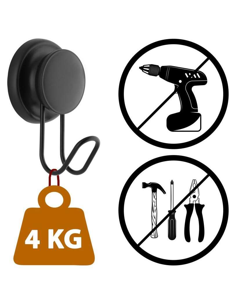 Četru āķu vannasistabas pakaramais ir praktisks un elegants papildinājums modernai vannas istabai. Pareizi profilēti āķi ir izgatavoti no melna (matēta) pulverkrāsota tērauda. Piestiprinās pie sienas ar diviem spēcīgiem piesūcekņiem. Īpaši piemērots vannas istabām, kas apdarinātas ar matētām porainām porcelāna flīzēm – piesūcekņa struktūra atgādina ļoti biezu želeju un tāpēc blīvi iesūcas porainās virsmās. Tas ir efektīvs arī uz flīzēm, lamināta, ledusskapjiem, stikla un citām gludām virsmām.